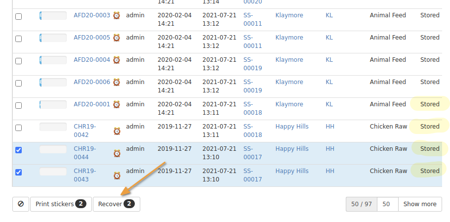 Filter the stored Samples on a list by selecting the Stored button at the top of the list. Select the Samples to be retrieved and click Recover. The Samples will be removed from storage in the LIMS, clearing its storage position and surfacing the Sample in its original workflow state