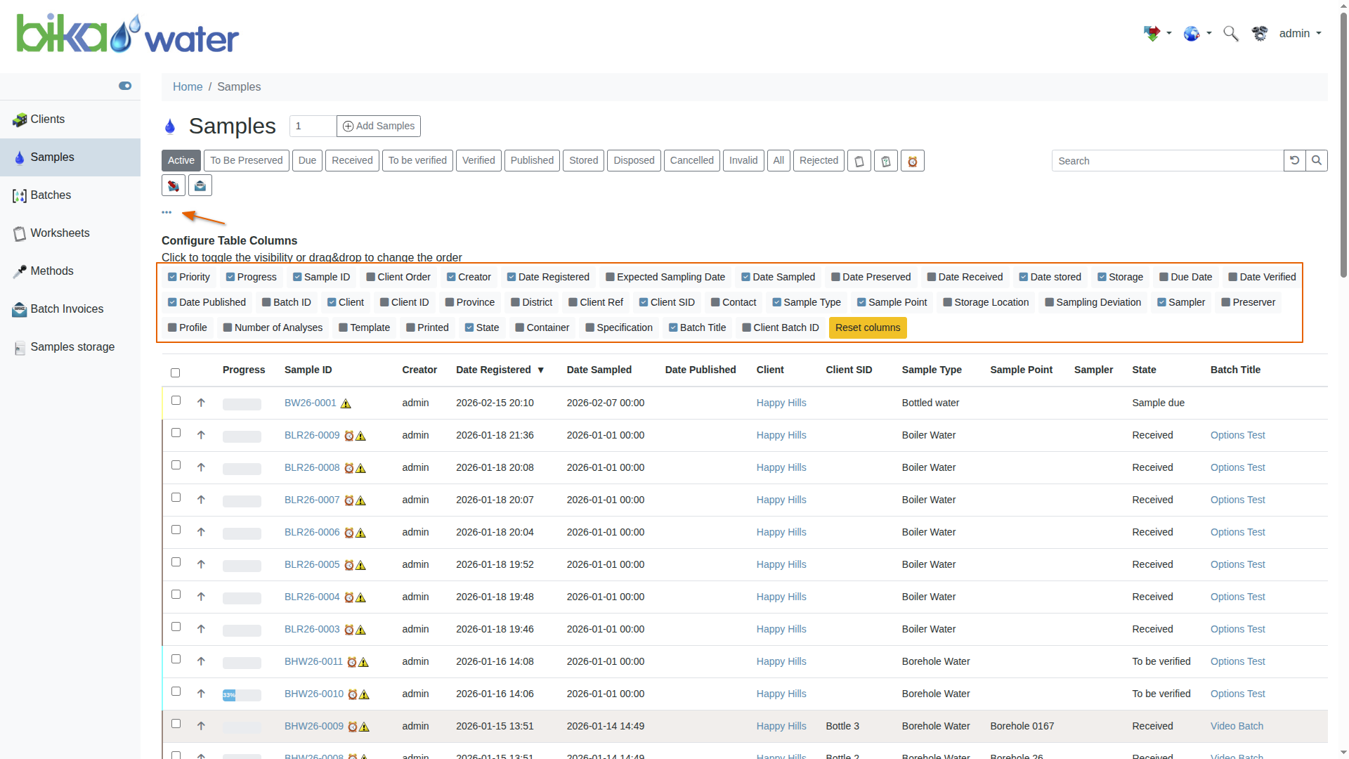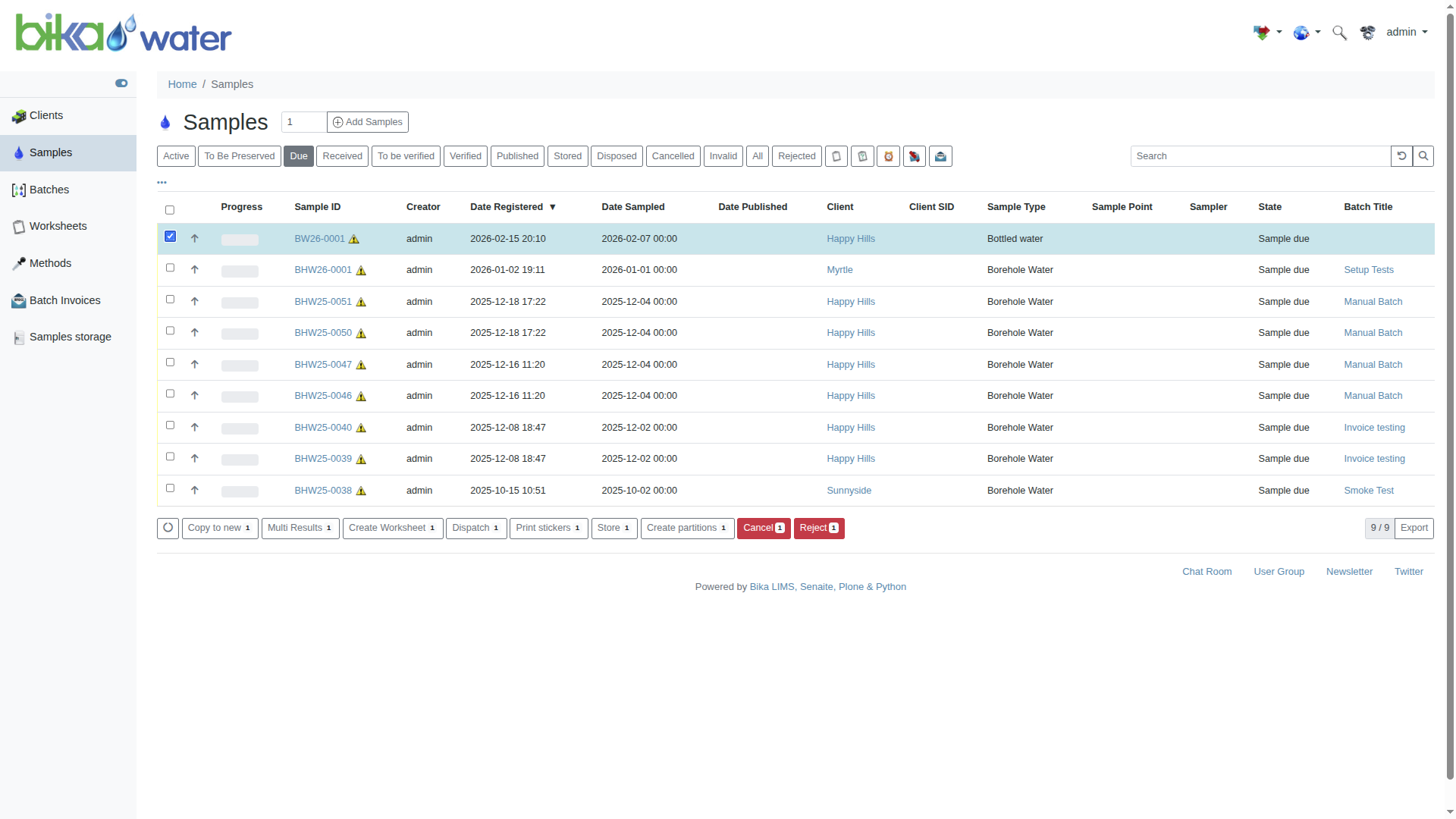 Samples can be filtered by state, To be Sampled, Due, received, Assigned, To be Verified, Verified and Published. Depending on the Samples selected, corresponding action buttons are rendered at the bottom of the list, e.g Copy, Receive, Publish etc.