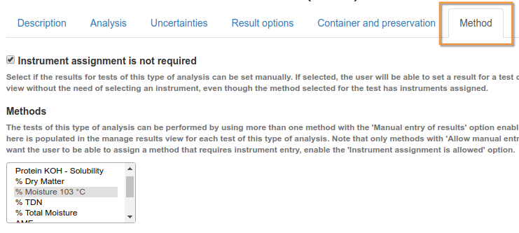 Manual analytical method selection in Bika Open Source LIMS
