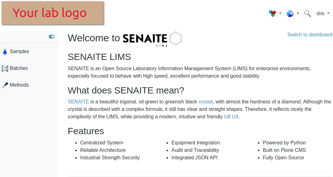 Client Contacts already logged in and not seeing the Lab's LIMS dashboard. are greeted with a rather bold Senaite front page