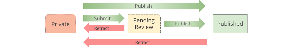 The owner of the document submits the document for publication, changing its state to pending review. In case he then decides to perform additional edits to this document, he can change its state by pressing retract, and he document will again be in private state
