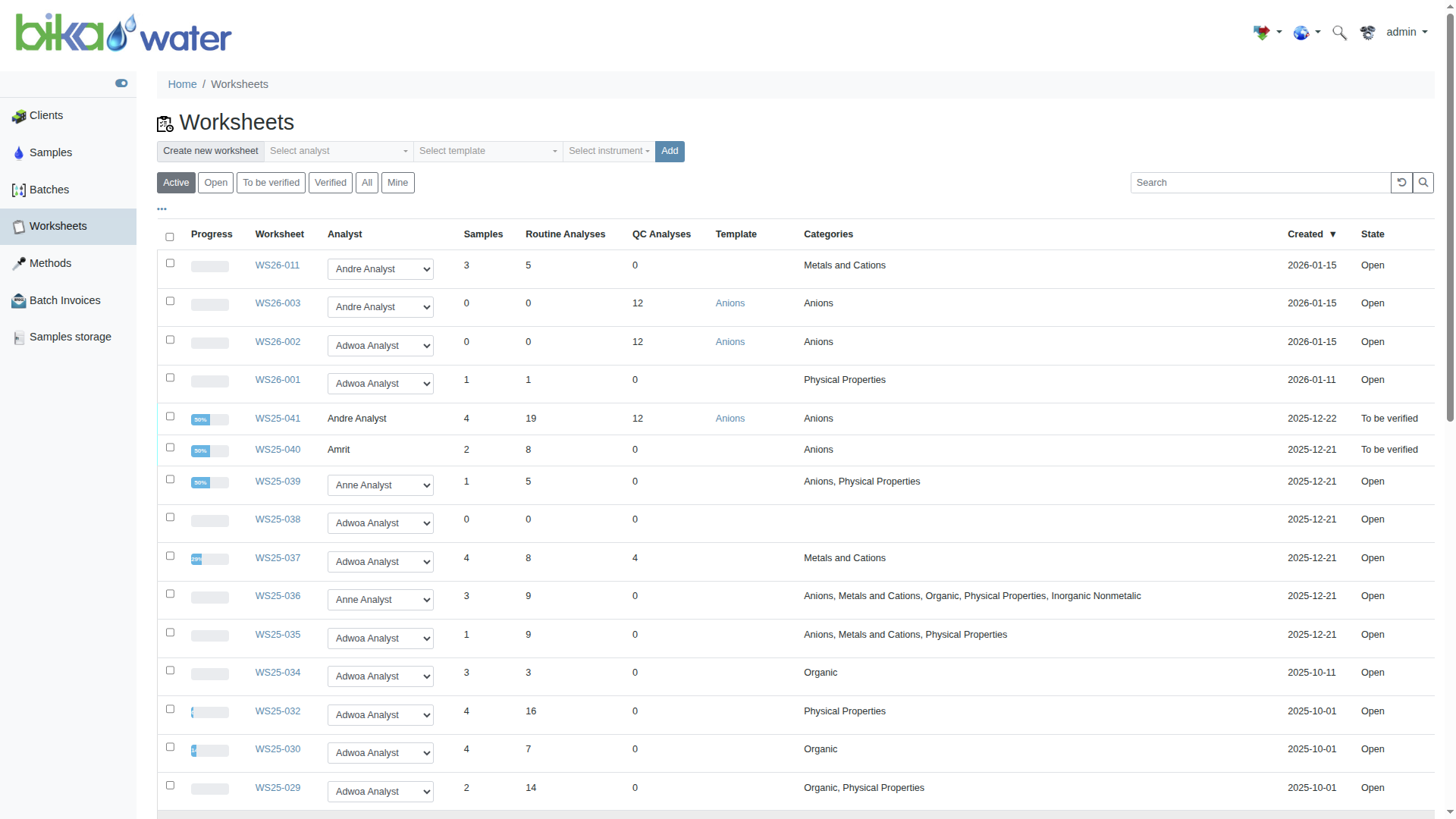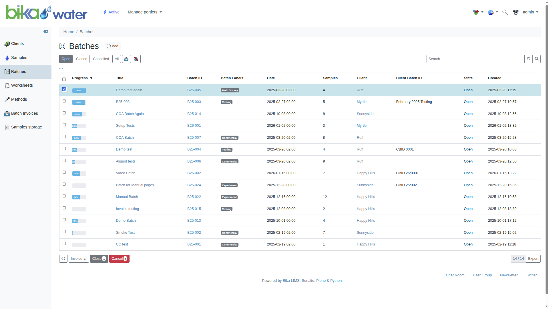 Samples can be filtered by state, To be Sampled, Due, received, Assigned, To be Verified, Verified and Published. Depending on the Samples selected, corresponding action buttons are rendered at the bottom of the list, e.g Copy, Receive, Publish etc.