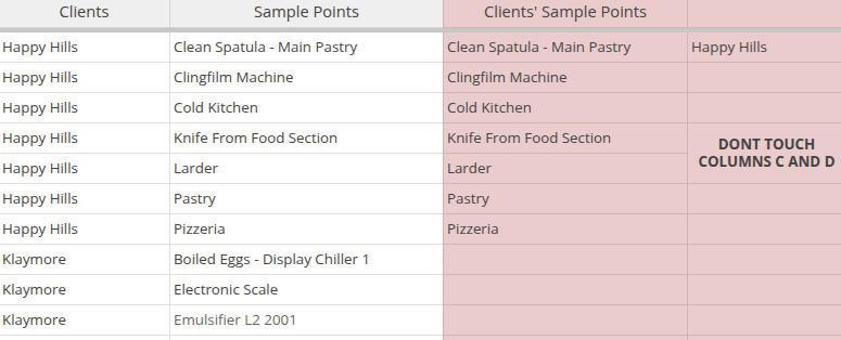 For the Client Sample Point and Contact lookups to work, note the areas shaded red on the Client Contacts and Sample Points sheets - they contain formulas to lookup the correct ones per Client and is best left untouched. Populate only the unshaded cells
