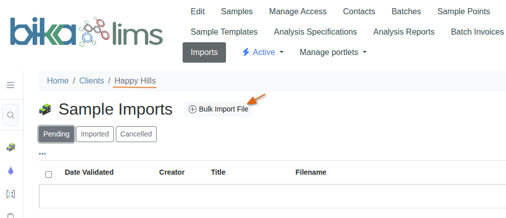 Navigate to Happy Hills' Imports page, all the Client's previous Imports are listed in states of Pending, Imported and Cancelled