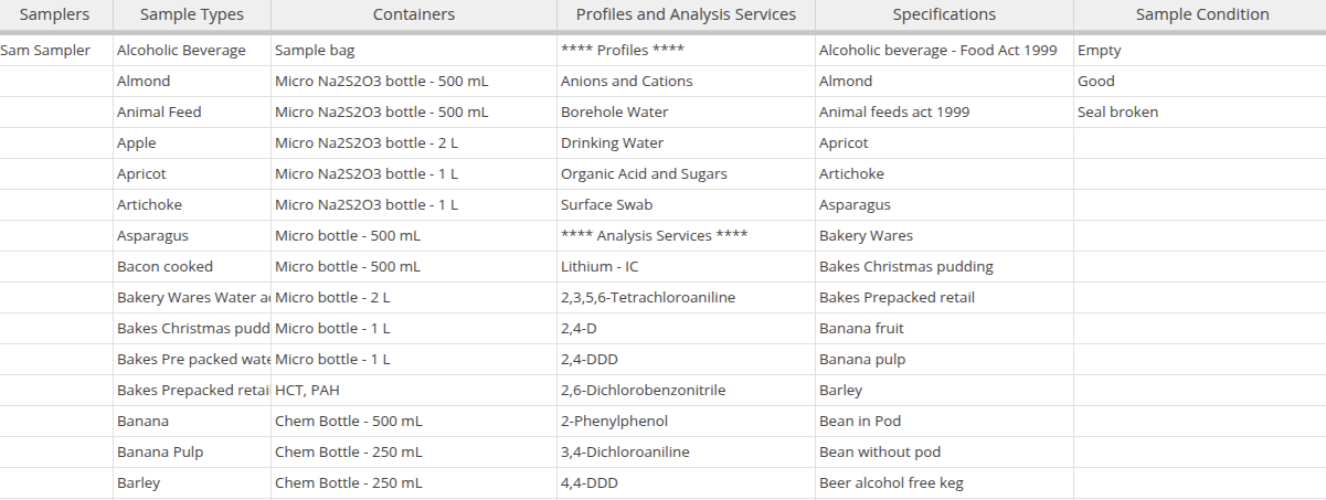 To speed up spreadsheet completion, secondary lookup sheets with data from the LIMS for Clients, Contacts, Sample Points and Sample Types, Profiles, Analysis Services etc. are available
